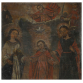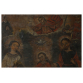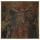 Pintura Hispano Americana. Cena da Sagrada Família encimada ao centro pelo Pai Eterno e o Divino Espírito Santo que projeta raios sobre o Menino. Óleo sobre tela, 56 cm x 58 cm. América Espanhola, séc. XVIII.