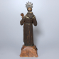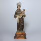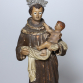 Santo Antônio. Imagem de Barro - Portugal, século XIX. Imagem de barro queimado, esculpido e policromado representado o Santo de pé, olhos de vidro, bom panejamento, pés nus, sobre base retangular almofadada de cantos ornados com volutas invertidas, segurando com a mão esquerda o Menino sentado sobre manto; 37,8 cm de altura total, com resplendor de prata de 4 cm de altura. Faltando braço esquerdo do Menino. Origem: espólio de Cárbia Sabatel Bourroul e José Celestino Monteiro de Barros Bourroul.