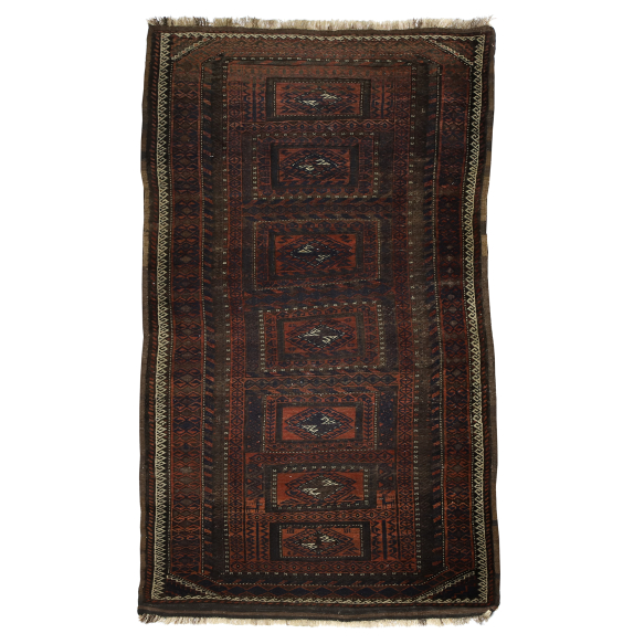 Tapete oriental - Paquistão, século XX. Tapete Belouch Afgan, ponto em nó feito à mão; 1,98 m x 0,94 m ou 1,86 m². Origem: espólio de Cárbia Sabatel Bourroul e José Celestino Monteiro de Barros Bourroul.