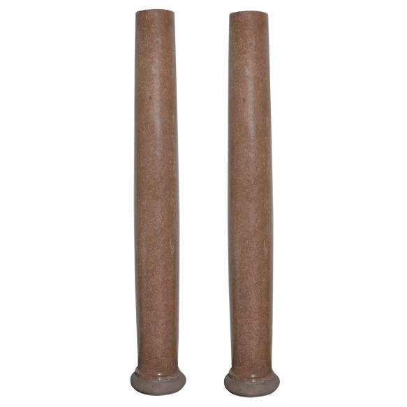 Par de colunas de granito Capri - Brasil, século XX. Par de colunas fusiforme de granito Capri polido encimando base côncava lavrada, também em granito Capri com 36 cm de diâmetro, sem polimento; 255,5 cm de altura total, cada. ATENÇÃO: Em se tratando de peças delicadas, especiais e de pesos elevados, é recomendado uma análise prévia antes da arrematação, considerando o manuseio e transporte, uma vez que, conforme item 13 das condições do leilão, a retirada é de inteira responsabilidade do comprador. Apresentam marcas do tempo. Origem: espólio de Cárbia Sabatel Bourroul e José Celestino Monteiro de Barros Bourroul.