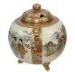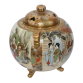 Queimador de incenso Hododa. Japãó, Era Meiji (1868–1912), c. 1880–1910. Queimador de incenso de porcelana policromada e dourada no padrão Satsuma. Corpo bojundo trípode, inteiramente decorado com paisagens, gueichas e cenas do cotidiano; dois pegas verticais diametralmente opostos e tampa com três furos codiformes. Ideogramas japonês no reverso do fundo, simbolo auspicioso de oferenda; 15,8 cm de altura total. Um dos pés, apresenta colagem ou fio de cabelo em seu entorno.