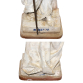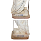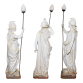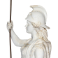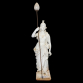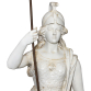 J. P. Valente, Devezas. Portugal, século XIX. Minerva. Escultura de faiança monocrômica branca, sob vidrado, modelada na figura da deusa grega da sabedoria, das artes e da guerra, Minerva. De pé, em em sua iconografia tradicional, trajando vestimentas e capacete de guerreira, segurando com a mão direita, ligeiramente estendida, haste metálica eletrificada terminada em suporte para lâmpada e manga ovóide de cristal, como se lança fosse. Apoiada sobre base retangular de 33 cm de comprimento, 31,5 cm de largura e 6,8 cm de altura onde, em seu entorno, encontram-se as inscrições: Minerva / A. Devezas / Jose P. Valente / (prejudicado para leitura). O todo sobre base móvel de mármore, com furo para apoio da haste; 145 cm de altura total e 181 cm, considerando a lança. Normalmente, por ficar exposta em áreas externas, apresenta marcas de ação do tempo, degastes no esmalte, manchas amareladas e pequenas perdas. Faltando o polegar da mão esquerda.