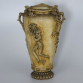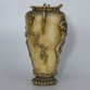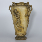 Ânfora de Cerâmica - Brasil, Século XX. Ânfora de cerâmica monocrômica creme sob verniz, modelada no formato de balaústre e ornada em relevos com elementos da videira e duas femininas opostas com torço desnudo e tocando harpa. Pescoço estreito e borda de contornos irregulares com três insignificantes trincos. Na parte inferior do corpo provável assinatura, ilegível; 37,3 cm de altura total. Uma das figuras apresenta perda da mão.