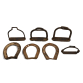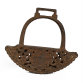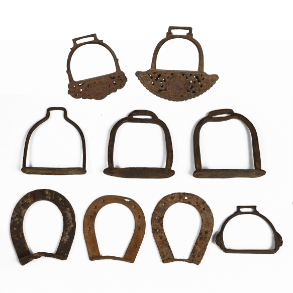 Conjunto formado por estribos e ferraduras, sendo: 1- Dois estribos de ferro fundido. Base semicircular, com borda movimentada e fenestrados centralizando Brasão da República; 16 cm e 14 cm de alturas e 17,7 cm e 13 cm de larguras. Brasil, séc. XX. Apresenta ferrugem. 2- Quatro antigos estribos e três ferraduras, de ferro fundido. Três estribos com 13,5 cm de alturas e 13,7 cm de larguras e um, com efígie na parte inferior, 9,1 cm de altura e 12,2 m de largura. Ferraduras com 14 cm de altura, cada. Brasil, século XX. Apresentam ferrugem.