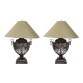 Par de abajures de metal patinado. Europa, século XX. Par de abajures de metal patinado. Corpo em balaustre, com vazados intercalados por elementos fitomórficos em relevos e encimados por faixa ornada com folhas de acanto, também em relevos. Base quadrada e escalonada de 20 cm de lados; 77,5 cm de altura total. Acompanha cúpula de tecido marrom no formato "chapéu chinês" que, internamente, apresentam manchas provocadas por umidade, sem interferir no visual externo.
