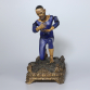 Nosso Senhor dos Passos - Portugal, século XIX. Imagem de vestir de madeira policromada, esculpida à maneira naturalista, representando Jesus Cristo na segunda Estação da Via Crucis. Cabeça lisa e inclinada para baixo, barba, braços articulados e móveis, corpo ereto com joelho direito apoiado sobre piso irregular e perna esquerda dobrada, pontos e linhas vermelhas sobre as partes do corpo, como se feridas e sangue fossem. O todo sobre base retangular dourada ornada com elementos repetitivos em relevos; 28,5 cm de comprimento,17,5 cm de largura e 34,5 cm de altura total. Está ausente o atributo desta iconografia, a cruz. Origem: espólio de Cárbia Sabatel Bourroul e José Celestino Monteiro de Barros Bourroul.