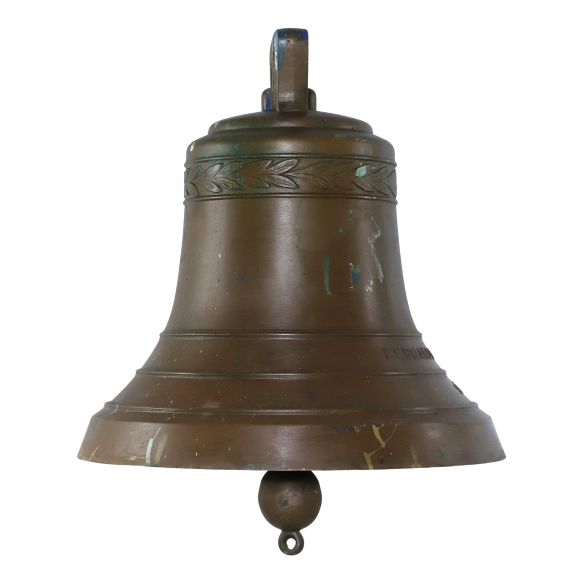 Sino de Fer Forgé. Brasil, Início Século XX. Sino de fer forgé patinado. Corpo decorado em sua parte superior com ramos de café e, na inferior, com anéis concêntricos e inscrição: Fernando Arens & Filho / São Paulo; 45,5 cm de diâmetro de boca e 46 cm de altura total.
