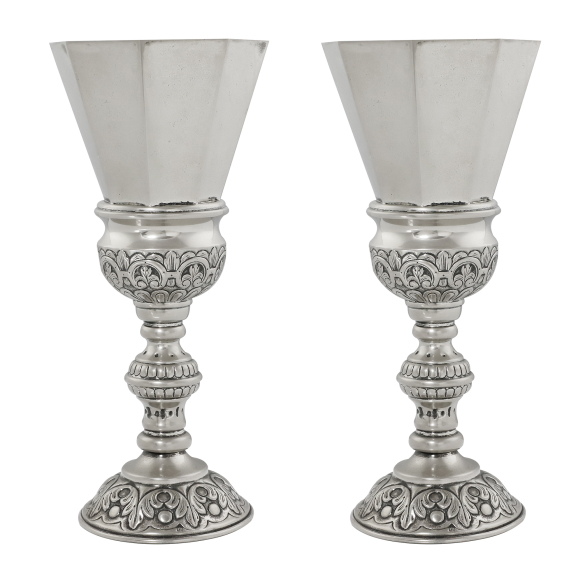 Par de floreiros - Europa, século XX. Par de floreiros de metal espessurado de prata. Corpo octogonal encimando haste em balaústre e base campanular; 33 cm de altura e 15 cm de diâmetro de boca. Origem: espólio de Cárbia Sabatel Bourroul e José Celestino Monteiro de Barros Bourroul.