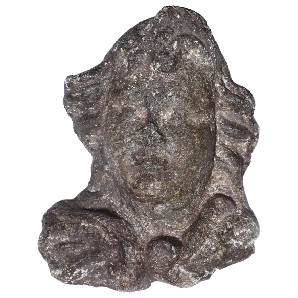 Cabeça de anjo em pedra lavrada, onde são visíveis traços de policromia parcialmente encobertos pela acentuada pátina. Remanescente decorativo dos antigos chafarizes de nossas cidades históricas; 31 cm de altura. Brasil, séc. XVIII.