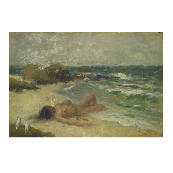 Pedro Bruno. Primeiro Estudo Para o Quadro Môema. Óleo sobre madeira, 24 cm x 35,3 cm. Assinado embaixo à direita: Pedro Bruno. No reverso etiqueta com inscrição datilografada: Pedro Bruno / Primeiro estudo para / o quadro "Moêma" / Coleção de / B.A. Pierotti. Provavelmente trata-se de uma releitura do icônico quadro de Victor Meirelles "Moema", de 1866, que retrata a personagem homônima do poema épico Caramuru, de Santa Rita Durão.