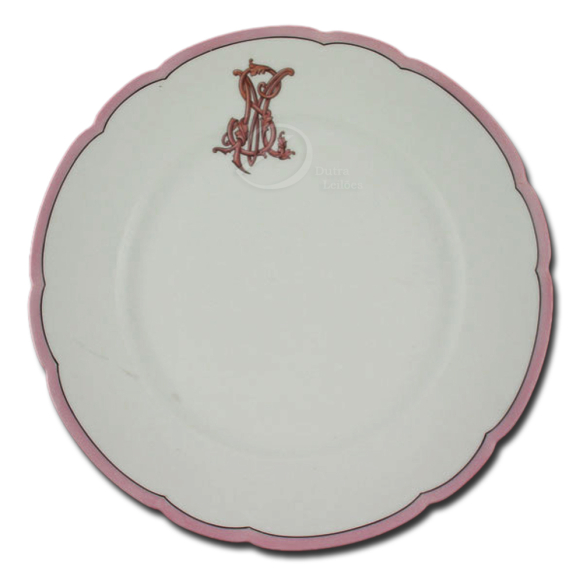 Dr. Sérgio Meira. Prato de porcelana francesa, pertencente a Sergio de Paiva Meira; aba delimitada por friso rosa e filete preto; na aba e parte da caldeira, à esquerda o monograma "SM" entrelaçado em rosa com realces em preto; no reverso marca GDA. França, séc. XIX. Foi o primeiro Diretor da Faculdade de Medicina da futura Universidade de São Paulo.