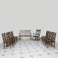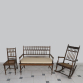 Conjunto de móveis para sala de visitas - Brasil, início século XX. Conjunto de móveis para sala de visitas de madeira nobre, composto de 10 peças: 1 sofá de dois lugares, com proteção de acolchoado revestido de tecido bege, medindo 125 cm de comprimento, 54,5 cm de largura e 99 cm de altura total; 8 cadeiras sem braços e 1 cadeira de balanço com 83 cm e 106 cm de alturas dos espaldares, respectivamente. Todas as peças com as mesmas características: espaldares vazados e ornados com colunelos em balaústres; assentos de palhinha; 4 pernas, sendo as anteriores torneadas e terminadas em ponteiras e as posteriores retangulares e ligeiramente curvas, unidas por traves fusiformes. Origem: espólio de Cárbia Sabatel Bourroul e José Celestino Monteiro de Barros Bourroul.