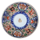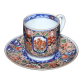 Xícaras e Pires de Porcelana Imari - Japão, Era Meiji (1868–1912), c. 1880–1910. Xícara e pires de porcelana no padrão Imari decorados em esmalte vermelho, azul, preto e ouro, com figuras holendesas centralizando reservas com caravelas, sobre fundo geométrico com crisântemos. No interior da xícara e na face do pires ideograma japonês, simbolo auspicioso de longevidade e felicidade; 5,5 cm e 11,5 cm de diâmetros, respectivamente e xícara com 5,8 cm de altura.