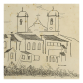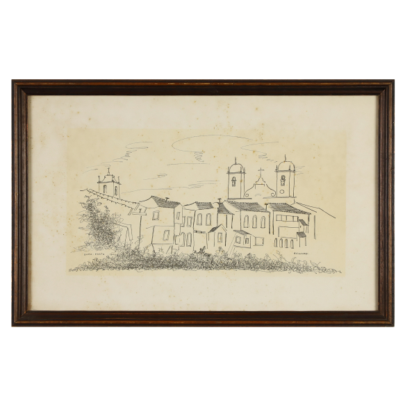 Guignard, Alberto da Veiga. Povoado com Igreja. Reprodução litográfica, 19 cm x 36,5 cm. Assinado embaixo à direita: Guignard. Origem: espólio de Cárbia Sabatel Bourroul e José Celestino Monteiro de Barros Bourroul.
