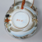 Xícara, Leiteira e Açucareiro de Porcelana - Japão, século XX. Conjunto de três peças, com seus respectivos pires, de fina porcelana japonesa, dita casca de ovo, ornadas com pintura policromada de paisagem e cenas do cotidiano. Xícara, cremeira e açucareiro com tampa. No reverso das bases ideograma em vermelho.