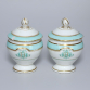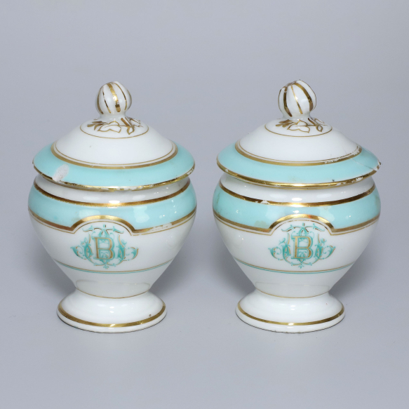 Par de cremeiras de porcelana, corpo com alça lateral decorado com friso verde água entre filetes dourados e tampa com pega no formato de fruto, monograma BJJ entrelaçado, marca F. Domartin Paris; 10 cm de altura. França, séc. XIX. Apresentam bicados.