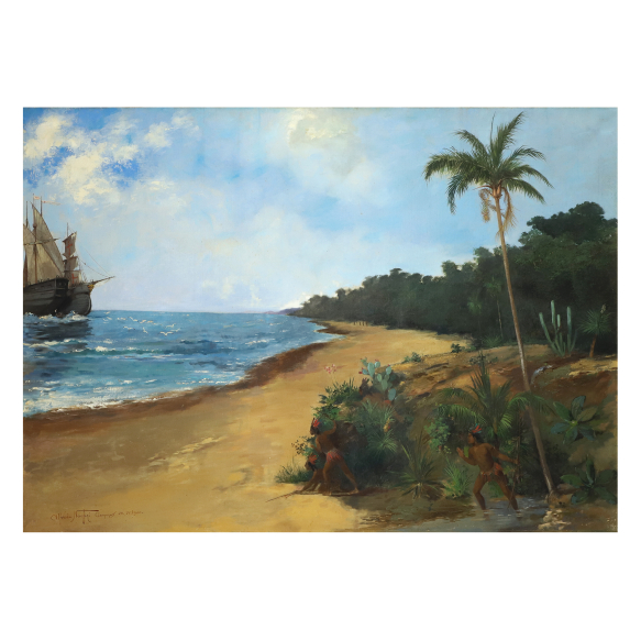 Alfredo Norfini. Alegoria a Chegada de Pedro Álvares Cabral em Porto Seguro. Óleo sobre tela, 84,5 cm x 117 cm. Assinado, datado e localizado embaixo à esquerda: Alfredo Norfini, Campinas, 28.IV.1900.