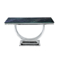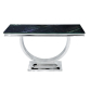 Par de aparadores Art Déco. Tampo retangular de grosso e delicado vidro temperado preto, com traços irregulares espelhados, sobre estrutura semicircular e base dupla escalonada, de aço polido; 120 cm de comprimento, 40 cm de profundidade e 74,5 cm de altura total. Europa, provavelmente Itália, séc. XX. Sobre o tampo, inscrição: tempered glass DP