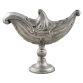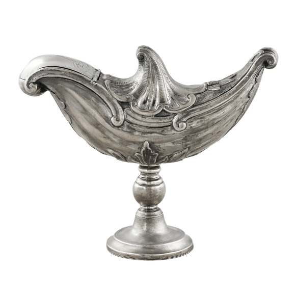 Naveta de metal - Brasil, século XIX / XX. Naveta oblonga com tampa articulada, de bronze fundido espessurado de prata, ornada com flores e elementos fitomórficos, em relevos e burilados. Haste em balaústre e base circular almofadada. Sem marcas de identificação, aparentes, 21,5 cm de comprimento e 17 cm de altura total. Origem: espólio de Cárbia Sabatel Bourroul e José Celestino Monteiro de Barros Bourroul.