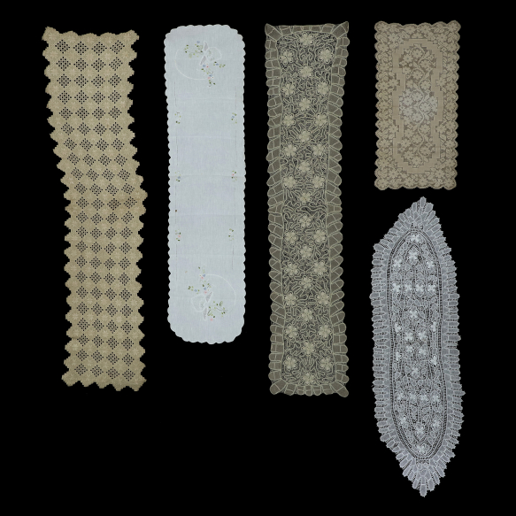Conjunto de cinco caminhos de mesa - Brasil, século XX. Conjunto de cinco caminhos de mesa, sendo: - Dois de renda Renascença, um branco e outro bege, de 170 cm e 215 cm de comprimentos e 50 cm e 43 cm de larguras, respectivamente, - Dois de tecido de algodão bege, sendo um rendado e outro bordado com vazados, de 98 cm e 210 cm de comprimentos e 43 cm e 45 cm de larguras; - Um de tecido de linho branco bordado com elementos florais coloridos, de 185 cm de comprimento e 40 cm de largura. Queira por gentileza examinar o lote antes da arrematação, uma vez que, eventualmente, pode apresentar marcas do tempo e uso. Origem: espólio de Cárbia Sabatel Bourroul e José Celestino Monteiro de Barros Bourroul.