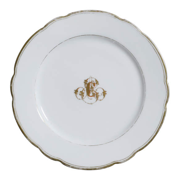Prato de porcelana francesa, aba com borda delimitada por filetes dourados, contendo monograma "AEC" entrelaçado, sem marcas aparentes; 21 cm de diâmetro. França, séc. XIX.