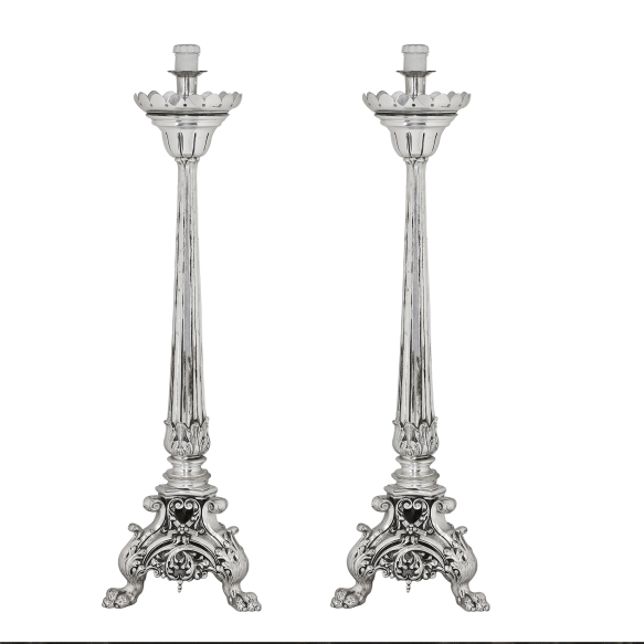 Par de tocheiros - Brasil, século XIX / XX. Par de tocheiros estilo D. José I, de metal repuxado, burilado e espessurado à prata, eletrificados. Haste estriada com base ornada em seu entorno por folhas de acanto com pontas reviradas, terminada em canopla campanular com borda recortada em semicírculos. Base trípode sobre pés de garras, com vazados e profusamente ornada por elementos característicos ao estilo: volutas, folhas de acanto, flores, pingentes; 83, 5 cm de altura, sem a cúpula cilíndrica, de cartão amarronzado, ornada nas extremidades por fina faixa de fios dourados e recurvos. Origem: espólio de Cárbia Sabatel Bourroul e José Celestino Monteiro de Barros Bourroul.