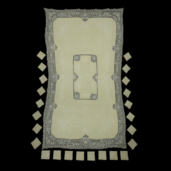 Toalha de mesa e vinte e quatro guardanapos - Brasil, século XX. Toalha de mesa e vinte e quatro guardanapos de tecido de linho bege com bordados e renda renascença em todo seu entorno; 343 cm e 34 cm de comprimentos e 180 cm e 33,5 cm de larguras, respectivamente. Origem: espólio de Cárbia Sabatel Bourroul e José Celestino Monteiro de Barros Bourroul.