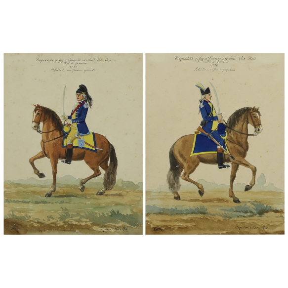 José Wasth Rodrigues. Par de aquarelas sobre papel com inscrição em suas partes superiores: Esquadrão q. fez a Guarda aos Srs. Vice-Reis / Rio de Janeiro / 1786. Soldado, uniforme pequeno. Oficial, uniforme grande, respectivamente; 28 cm x 21 cm, cada. Siglados embaixo à esquerda J.W.R e inscrição à direita: Arquivo Nac. Rio.