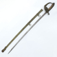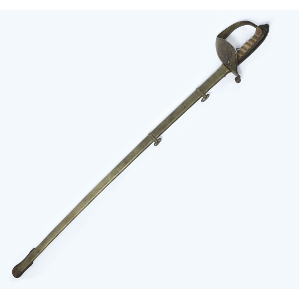 Espada Militar. República Velha - Brasil, primeira metade do século XX. Espada bainha de metal e lâmina de aço. Guarda com brasão da república velha, Brasil ainda grafado com a letra Z; empunhadura de madeira revestida de couro; lâmina também com brasão da república; 82 cm de comprimento. Provável fabricação da P.D.L, empresa gaucha de Porto Alegre.