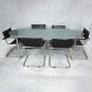 Conjunto de mesa e seis cadeiras. Mesa com tampo oval, de grosso vidro jateado com 10 mm de espessura, sustentado por quatro traves presas a pés cilíndricos cromados, em seus ângulos retos; 217 cm de comprimento, 117 cm de largura e 72 cm de altura total. Brasil, séc. XX. O tampo de vidro apresenta pequenos bicados, com perda do jateado Cadeiras com estruturas tubulares curvas, sendo três cromadas e três prateadas e fosqueadas. Assento e encosto de material sintético preto, como se couro fosse; 79 cm de altura total. Brasil, séc. XX. Uma cadeira está com o encosto rompido.