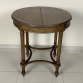 Mesa auxiliar de madeira nobre envernizada. Brasil, século XX. Mesa auxiliar de madeira nobre envernizada. Tampo circular dividido em duas seções, sobre saia lisa e quatro pernas cilíndricas e filetadas, terminadas em ponteiras e unidas abaixo por quatro traves côncavas; 74 cm de diâmetro e 80 cm de altura total. Apresenta marcas do tempo e uso. Origem: espólio de Cárbia Sabatel Bourroul e José Celestino Monteiro de Barros Bourroul.