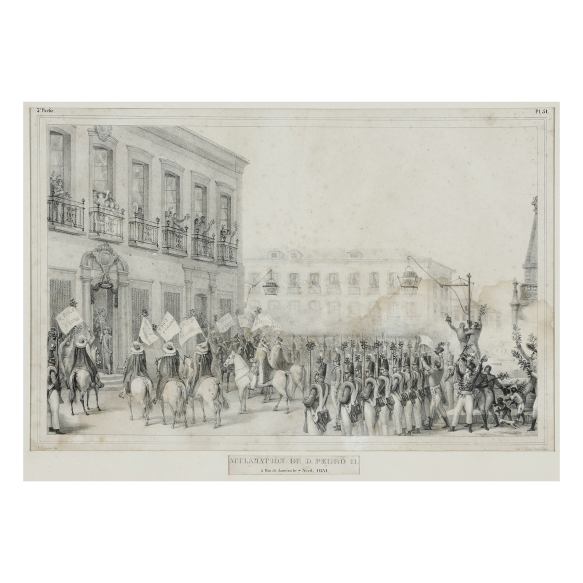 Debret, J. B. Acclamation de D. Pedro II - à Rio de Janeiro le - Avril, 1831. Litografia em preto e branco de Thierry Frères, 22,8 cm x 36,1 cm (a mancha). França, séc. XIX.