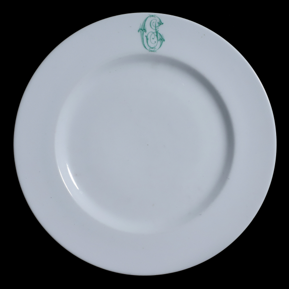 Prato de porcelana alemã, na aba o monograma "CJ" entrelaçado em verde, no reverso marca Pirkenhammer e selo de coleção; 24 cm de diâmetro. Alemanha, séc. XIX.