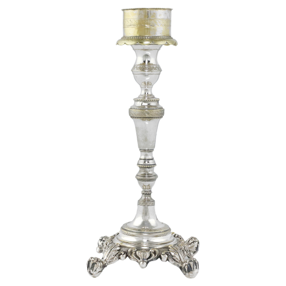 Castiçal - Brasil, século XIX / XX. Castiçal de metal prateado fundido e cinzelado, ornado com folhagens, perolados e elementos repetitivos. Haste segmentada em balaústres divididos por anelados. Açucena cilíndrica com borda revirada. Sem marcas aparentes de identificação; 27,8 cm de altura total. Origem: espólio de Cárbia Sabatel Bourroul e José Celestino Monteiro de Barros Bourroul.