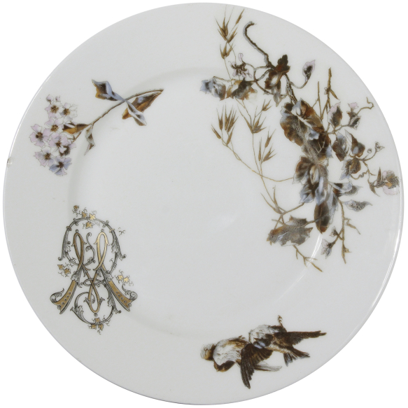 Prato de porcelana monogramada, aba com borda lisa, decorada por ramos e pássaros e deslocada à direita EW entrelaçado, sem marcas aparentes; 22 cm de diâmetro. França, séc. XIX. Apresenta pequeno bicado na borda.