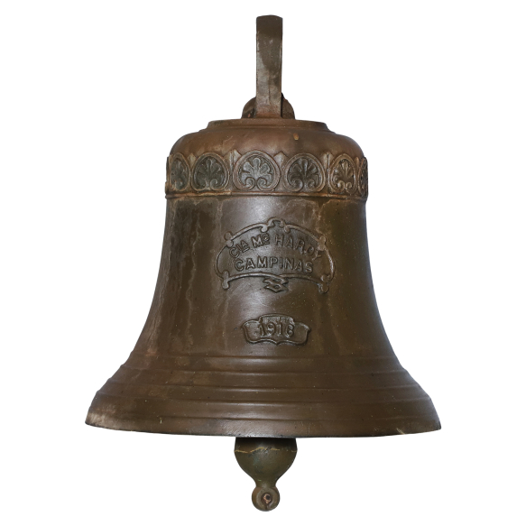 Sino de Fer Forgé. Brasil, Início Século XX. Sino de fer forgé. Corpo com duas reservas, uma com nome do fabricante Cia Mo Hardy / Campinas e outra, logo abaixo, com a data de 1916; ambas centralizadas por faixas horizontais. Parte inferior decorada com anéis concêntricos e, a superior, com trevo de cinco pontas entre volutas; 25,5 cm de diâmetro e 41 cm de altura. Apresenta marcas do tempo.
