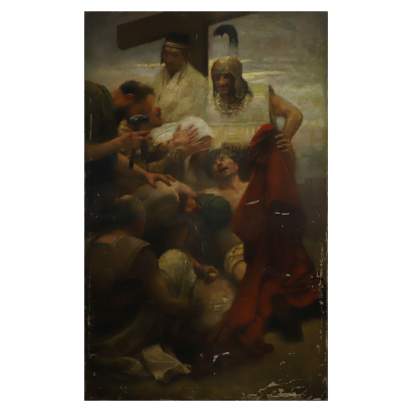 Autoria não Identificada. Décima Estação da Via Sacra. Itália, Século XIX. Soldados Lançando Sorte Sobre as Vestes de Cristo ou O Jogo de Dados Pela Túnica de Cristo. Óleo sobre tela, 210 cm x 110 cm. Assinado embaixo à direita F. Borj (?). Apresenta algumas perdas de matéeria algumas perdas de matéria.