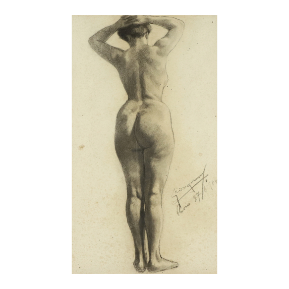 Georgina de Albuquerque. Nu Feminino. Lápis crayon sobre papel, 60 cm x 34 cm. Assinado, localizado e datado embaixo à direita: Georgina / Paris 17/6 - 904.