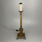 Abajur de metal com cúpula bege - Brasil, século XX. Abajur, com coluna e haste de metal patinado de marrom, e base metálica dourada sobre quatro pés em volutas, como se castiçal fosse; 72 cm de altura total ou 53 cm, sem a cúpula de tecido bege. Origem: espólio de Cárbia Sabatel Bourroul e José Celestino Monteiro de Barros Bourroul.