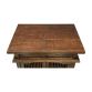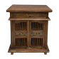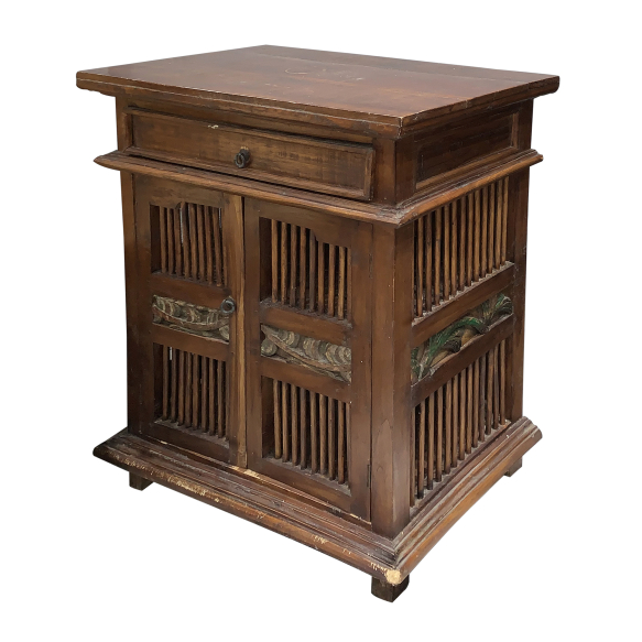 Móvel Auxiliar. Brasil, século XX. Móvel auxiliar de madeira nobre envernizada. Tampo retangular encimando caixa com uma gaveta central e vão livre dividido por prateleira. Frente e laterais de duas seções em colunelos divididas por faixa lavrada e policromada com elementos fitomórficos; 67,5 cm de comprimento, 39,3 cm de largura e 82 cm de altura total. Apresenta pequenas marcas do tempo e uso.