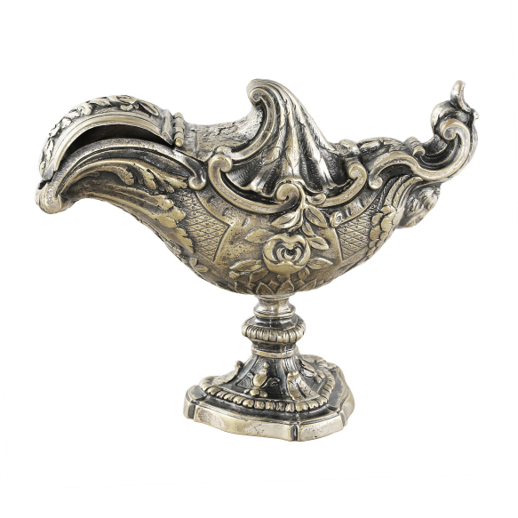 Naveta de metal - Brasil, século XIX / XX. Naveta de bronze com vestígios de espessuramento à prata. Formato de lamparina, com tampa articulada ornada com arranjo floral e, no seu todo, por elementos fitomórficos em relevos. Haste segmentada e base triangular e movimentada; 18,5 cm de comprimento e 15 cm de altura total. Origem: espólio de Cárbia Sabatel Bourroul e José Celestino Monteiro de Barros Bourroul.