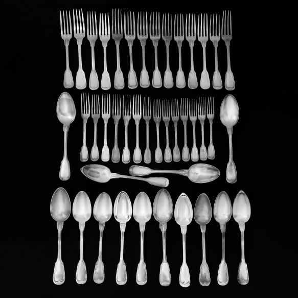 Parte de faqueiro de metal prateado Christofle - França, século XX. Parte de faqueiro de metal prateado comporto de 42 peças, assim discriminadas: garfo: 14 principais e 14 para sobremesa - colher: 14 principais. Sobre as peças marcas de identificação do fabricante: Christofle. Apresenta pequenas variações de tamanho e formato, assim como marcas do tempo e uso. Origem: espólio de Cárbia Sabatel Bourroul e José Celestino Monteiro de Barros Bourroul.