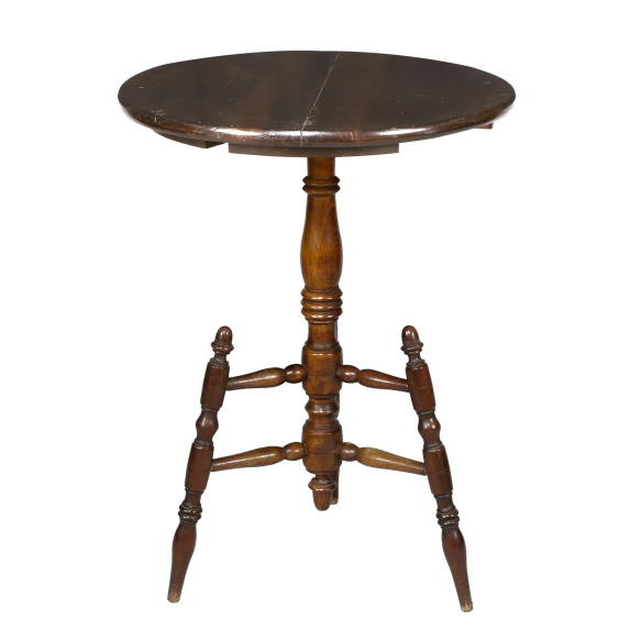 Mesa Auxiliar de Madeira Nobre - Brasil, século XX. Mesa auxiliar de madeira nobre envernizada. Tampo circular sobre haste longitudinal lavrada em balaústres centralizada por triplos pés torneados com traves duplas; 60 cm de diâmetro e 79 cm de altura total. Origem: espólio de Cárbia Sabatel Bourroul e José Celestino Monteiro de Barros Bourroul.