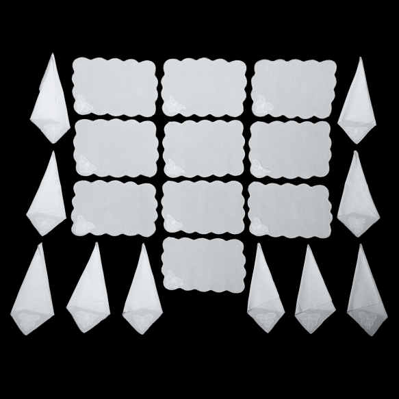 Jogo Americano e tecido de linho - Brasil, século XX. Jogo americano de tecido de linho branco com renda Renascença e remates de crochê nos entornos de suas dez toalhas e seus respectivos guardanapos de 40 cm de lados; 53 cm de comprimento e 36 cm de largura. Queira por gentileza examinar o lote antes da arrematação, uma vez que, eventualmente, pode apresentar marcas do tempo e uso. Origem: espólio de Cárbia Sabatel Bourroul e José Celestino Monteiro de Barros Bourroul.