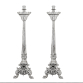 Par de tocheiros - Brasil, século XIX / XX. Par de tocheiros estilo D. José I, de metal repuxado, burilado e espessurado à prata, eletrificados. Haste estriada com base ornada em seu entorno por folhas de acanto com pontas reviradas, terminada em canopla campanular com borda recortada em semicírculos. Base trípode sobre pés de garras, com vazados e profusamente ornada por elementos característicos ao estilo: volutas, folhas de acanto, flores, pingentes; 83, 5 cm de altura, sem a cúpula cilíndrica, de cartão amarronzado, ornada nas extremidades por fina faixa de fios dourados e recurvos. Origem: espólio de Cárbia Sabatel Bourroul e José Celestino Monteiro de Barros Bourroul.