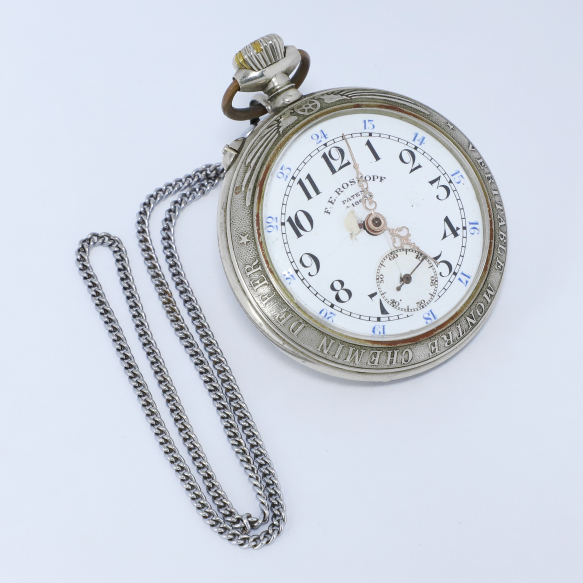 Relógio de bolso F. E. L.E. Roskoff - Suíça, século XX. Relógio de bolso, também conhecido como de algibeira, à corda . Formato circular, caixa metálica, mostrador esmaltado de branco com marcador de segundos e inscrição F.E. Roskoff / Patente / 18632; números em algarismos arábicos em duas cores, preto AM (ante meridiem) e azul PM (Post meridiem). Inscrições, todas em relevos: Internamente, em seu reverso, F.E. Roskoff sobre paisagem; centralizadas por 6 medalhas, três de cada lado, Expositions / Universelles / Paris 1900 / Liege 1905 / Milan 1906. Na parte interior da tampa, 76735, na exterior, Logomarca do fabricante L.E. Roskoff, locomotiva ladeada pela inscrição Veritable Montre Chemin de Fer; inscrição que se repete na aba de sua caixa; 5,1 cm de diâmetro e 7,1 cm com anel de sustentação de corrente metálica, que acompanha o relógio. Funcionando. Apresenta pequena perda de esmalte, na parte central do mostrador, assim como pequeno trincado, iniciado na junção dos ponteiros e estendendo-se até o centro do ponteiro de segundos.