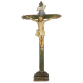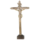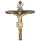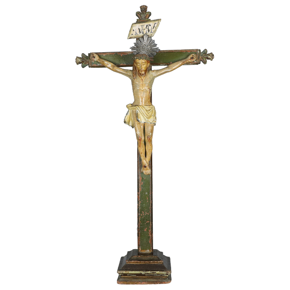 Cristo crucificado em madeira policromada, com pintura original, cruz arrematada por ponteiras no estilo D. José I brasileiro. Coroa de espinhos entalhada no mesmo bloco e a figura do Crucifixado trabalhada em pujante realismo da dor extremada no realismo da anatomia dorsal. Sob a tarja onde se lê "INRI", resplendor também D. José encima a cabeça do Cristo; 37 cm e 72,7 cm de altura. Brasil, séc. XVIII.