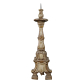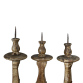 Banqueta de Altar. Brasil, século XVIII. Incomum e rara banqueta de altar composta por seis tocheiros, policromados e aplicações de ouro sobre os relevos, com elementos dos mais puros e característicos do Barroco Brasileiro. Fustes com quatro reservas superpostas, centralizadas por curvas e contra curvas; base trípode, sendo a perna posterior curva. Terminados acima em bobeches circulares e suportes para vela com corpo em balaústre, de borda ligeiramente revirada; Alturas variando de 58 cm a 60 cm. Apresentam, na policromia e no ouro desgastes e oxidação naturais da ação do tempo, assim como perdas insignificantes, em momento algum interferindo na beleza e harmonia do conjunto, tornando-o cada vez mais belo e original, assim como um testemunho inquestionável de época, atribuída na classificação.