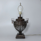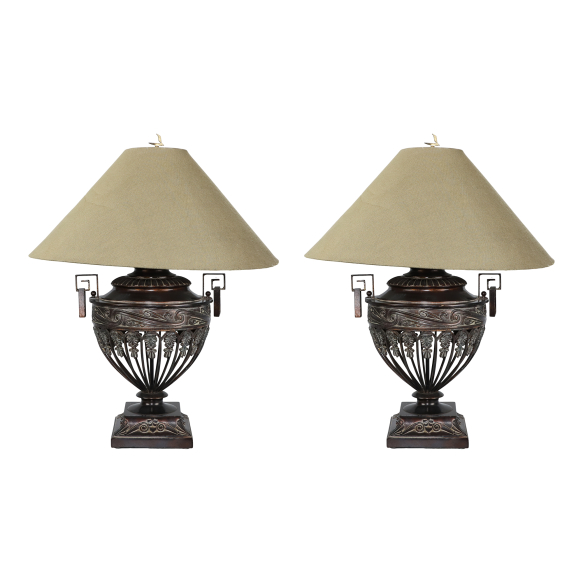 Par de abajures de metal patinado. Europa, século XX. Par de abajures de metal patinado. Corpo em balaústre, com vazados intercalados por elementos fitomórficos em relevos e encimados por faixa ornada com folhas de acanto, também em relevos. Base quadrada e escalonada de 20 cm de lados; 77,5 cm de altura total. Acompanha cúpula de tecido marrom no formato "chapéu chinês" que, internamente, apresentam manchas provocadas por umidade, sem interferir no visual externo.
