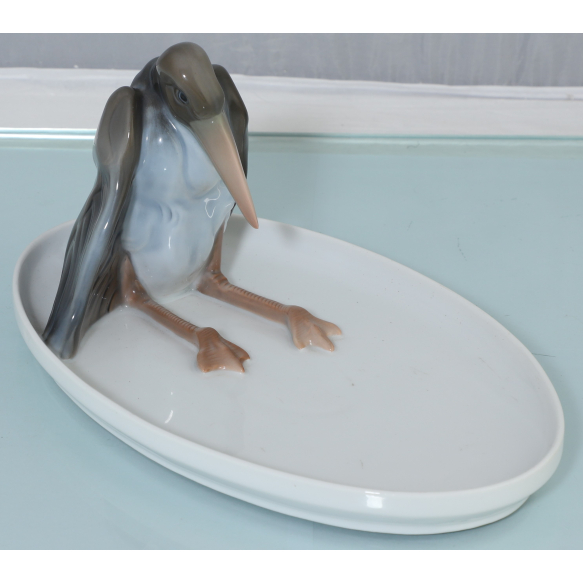 Josef Fischer, para Rosenthal. Grupo escultórico de porcelana policromada, Art Nouveau, modelado na figura de marabu pousado sobre travessa ovalada onde, em seu reverso, encontra-se marca de identificação, em verde: Rosenthal Selb-Bavaria; 27,5 cm de comprimento, 16,5 cm de largura e 13,5 cm de altura total. Alemanha, séc. XX. Modelo projetado por Josef Fischer em 1910.